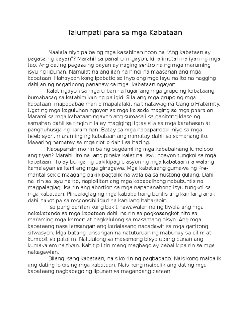 TalumpatiTugon ng mga Kabataan sa mga Isyu ng lipunan. TALUMPATI Ang pandemya ay isang bagay na tayong lahat ay nakaransan ngunit sa talumpati na ito ating makikita na tungkol ito sa ibat-ibang karanasan nating lahat. Itoy isang talumpating aking inihahandog para sa mga Kabataang Pilipino.
