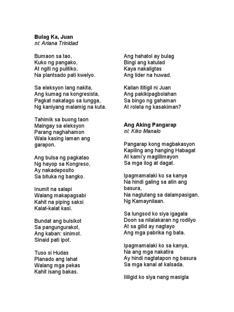 TULA Sa artikulong ito tatalakayin natin ang ibat ibang halimbawa ng mga tulang Pilipino. Ang sulat na ito ay isang pagbibigay-liwanag sa mga isyu ng mga Pilipino na hindi nakapanood ng bilangan lalo. Sa panahon ng eleksyon.