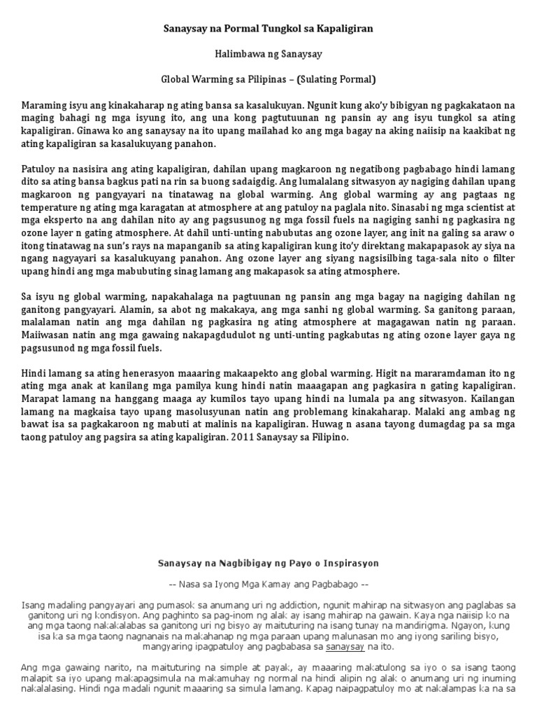 Mga Sanaysay sa Filipino Ang blog na ito ay naglalaman ng mga tagalog na sanaysay na may uri na pormal o di-pormal. Sulating Pormal Halimbawa ng Tagalog na Sulating Pormal Hawla ng Ibon. Kapre tikbalang manananggal tiyanak multo at mangkukulam.