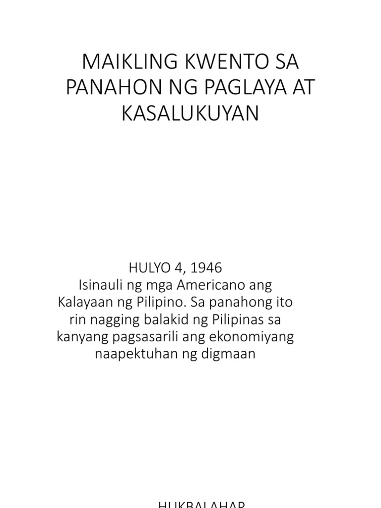 PANAHON NG PAGLAYA AT KASALUKUYAN HULYO 4 1946 Isinauli ng mga Americano ang Kalayaan ng Pilipino. Kahit suyuin pa at pakamahalin Aywan bat ang nasa ay makaalpas din. Maikling kwento tungkol sa kalikasan ang ihahatid namin sa inyo.