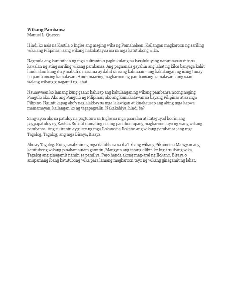Ang paksa ng talumpati ni Manuel L. Si Manuel Luis Quezon ay kilala bilang Ama ng Wikang Filipino. Si Manuel Luis Quezon y Molina 19 Agosto 1878 1 Agosto 1944 ay ang ikalawang Pangulo ng Republika ng Pilipinas 15 Nobyembre 1935 1 Agosto 1944 na makikita sa dalawampung pisong papel na isyu ng Bangko Sentral ng Pilipinas.