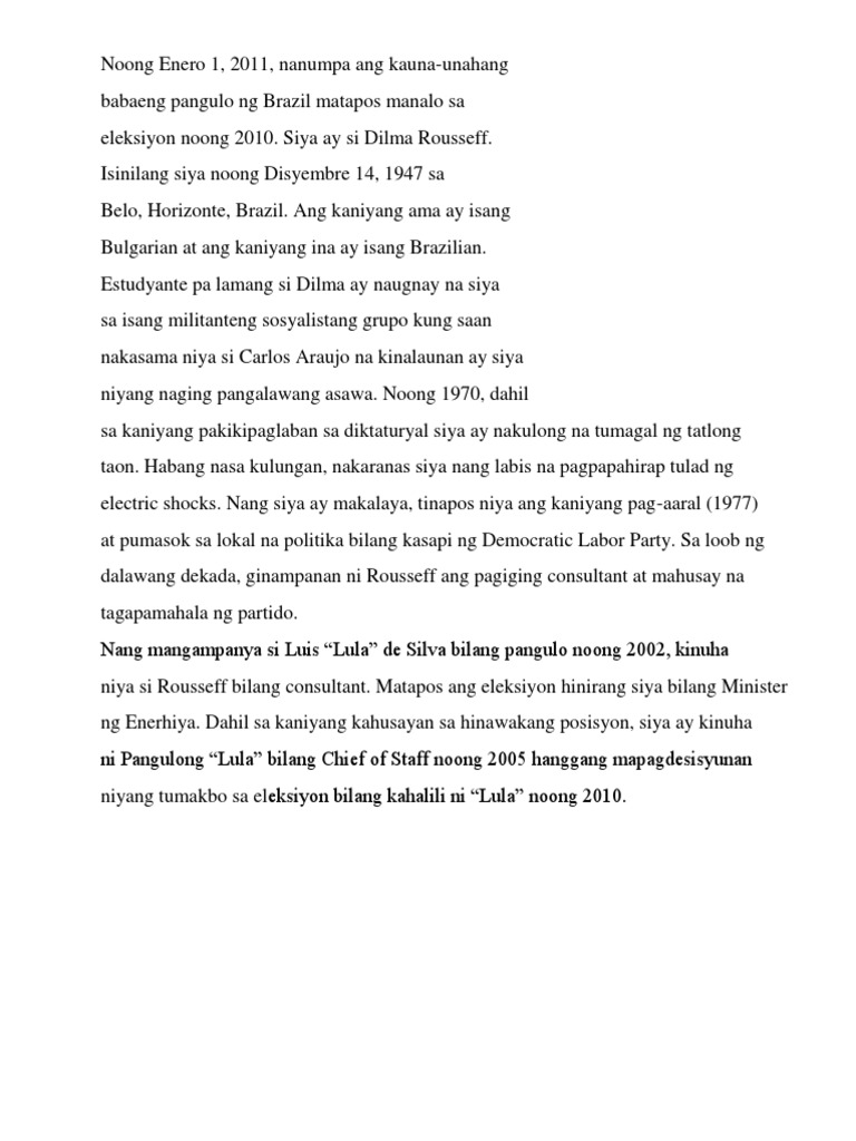 Aralin21 dilma rousseff 1. REAKSYON SA TALUMPATI NI DILMA ROUSSEFF Ang talumpati ay tungkol sa mga nais makamit ni Pangulong Dilma Rouseff para sa bansang BrazilGustong mailahad ang kanyang magagandang tunguhin para sa bansang Brazilgusto niyang tiyakin ang kanyang pamahalaan ay lalabanan at susugpuin ang labis na kahirapan gayundin ang lumikha ng mga. IV PROSESO NG PAGKATUTO A.